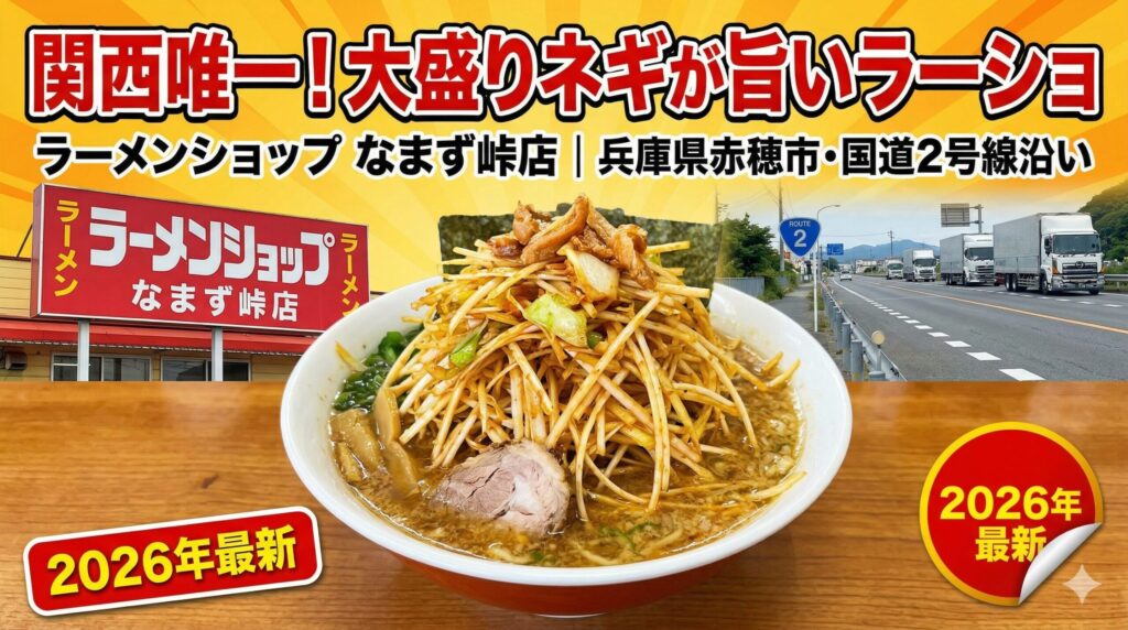 兵庫県赤穂市西有年の国道2号線沿いにある「ラーメンショップ なまず峠店」は関西唯一のラーメンショップFC。大量の白ネギが乗ったネギラーメンが人気で、トラックドライバーにも愛される人気店です。実際に食べてきた感想・メニュー・アクセスをご紹介します。 -