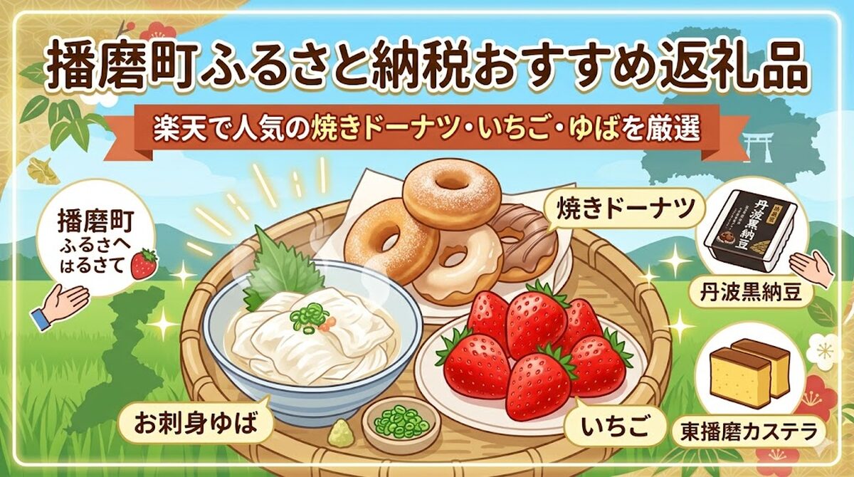 この記事では、お刺身ゆば・丹波黒納豆・いちご・焼きドーナツ・東播磨カステラなど播磨町の返礼品を楽天で実際に確認して厳選。小さな町の手作りの良さが光る返礼品ばかりです。