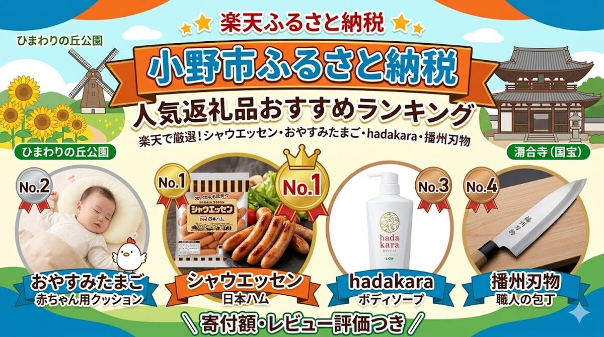 この記事では、シャウエッセン・おやすみたまご・hadakara・播州刃物の包丁など小野市の返礼品を厳選。すべて楽天ふるさと納税で実際に確認して、リピーターの多い実力派だけをピックアップしました。