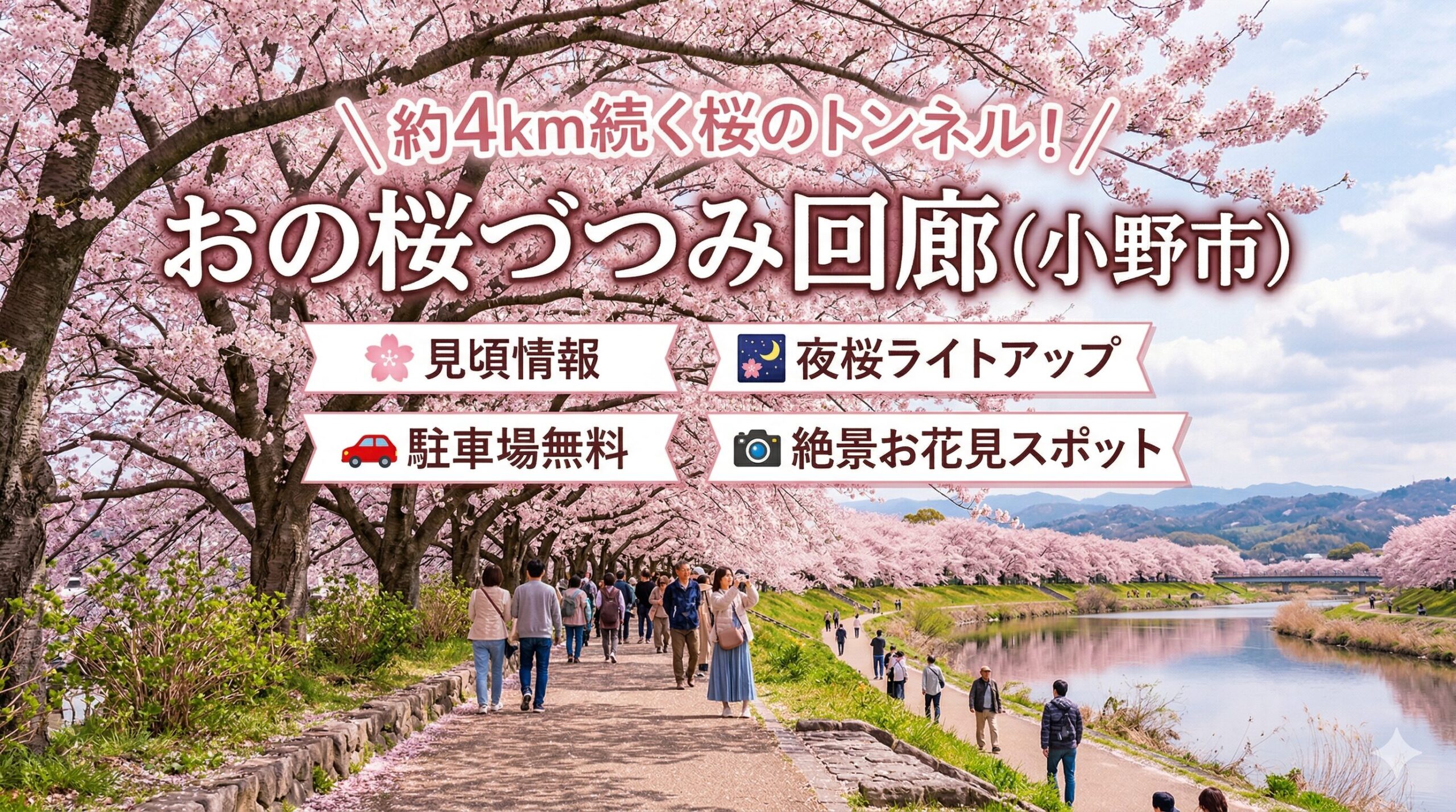 兵庫県小野市を流れる加古川の右岸堤防に、約4kmにわたって桜並木が続く「おの桜づつみ回廊」。両側から枝が頭上で交わる「桜のトンネル」は播磨地域でも屈指のスケールで、見頃の時期には桜色の天蓋の下を歩く幻想的なお花見が楽しめます。無料駐車場が複数整備されており、夜桜のライトアップも毎年実施されることから、地元はもちろん姫路・加古川・三木方面からも多くの花見客が訪れます。